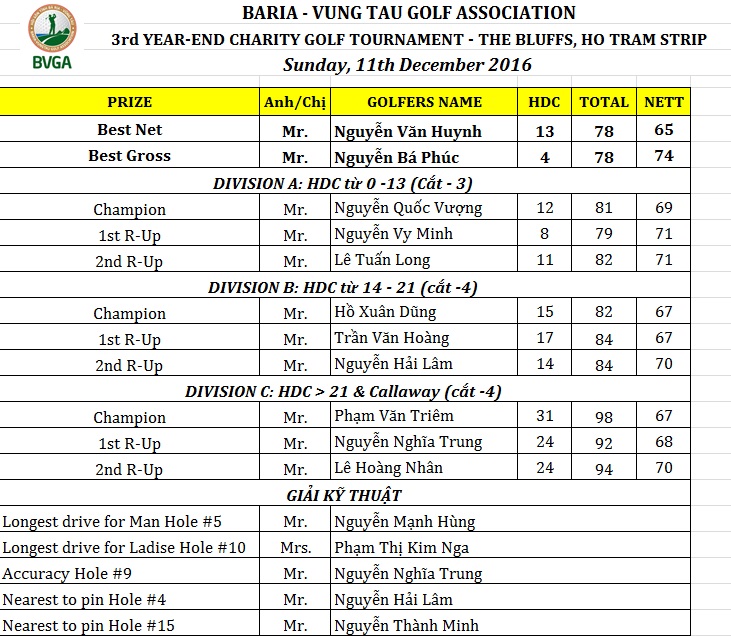 Hôm 11/12, Hội Golf Bà Rịa Vũng Tàu (BVGA) đã tổ chức giải từ thiện cuối năm (lần thứ III) tại Câu lạc bộ The Bluffs, thuộc phức hợp nghỉ dưỡng giải trí Hồ Tràm Strip (xã Phước Thuận, huyện Xuyên Mộc). Số tiền thu được từ lệ phí thi đấu của các gôn thủ và hoạt động đấu giá tại giải đạt 520 triệu đồng. Ban tổ chức sẽ sử dụng số tiền này vào việc mua quà tặng người nghèo vào dịp Tết. Dưới đây là kết quả thi đấu: